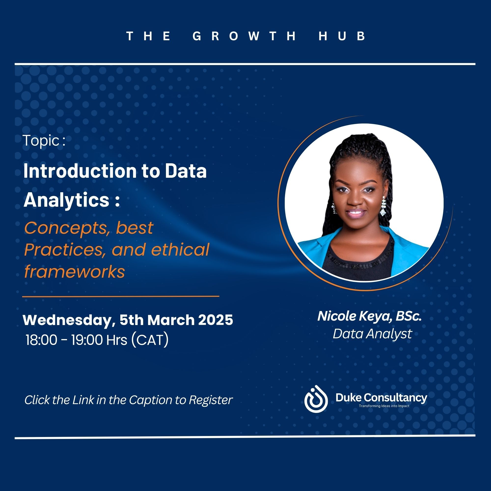 #DataAnalytics #DataDriven #AnalyticsTraining #ProfessionalDevelopment #DataVisualization #EthicalAI #M&E #CareerGrowth #Webinar #dukeconsultancy #growthhun